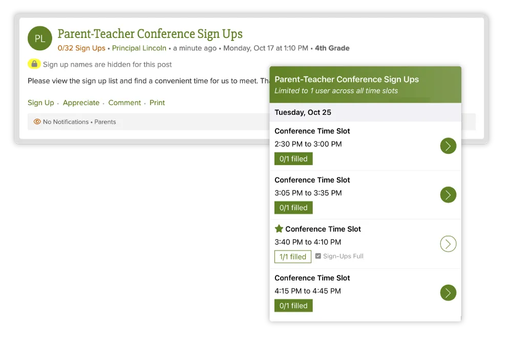 Posts are at the heart of communication on the ParentSquare platform. Conference invitations go out as ParentSquare posts that include appointment sign-up slots, so families can both see necessary details and take action in one trusted place.